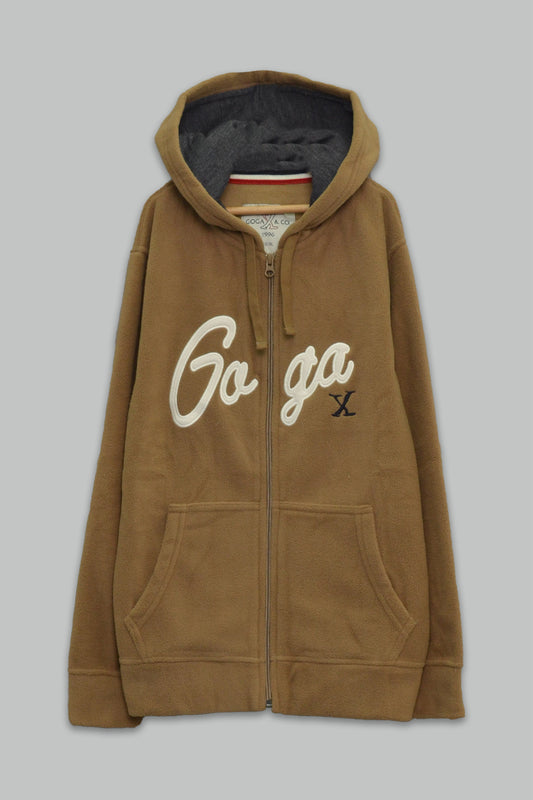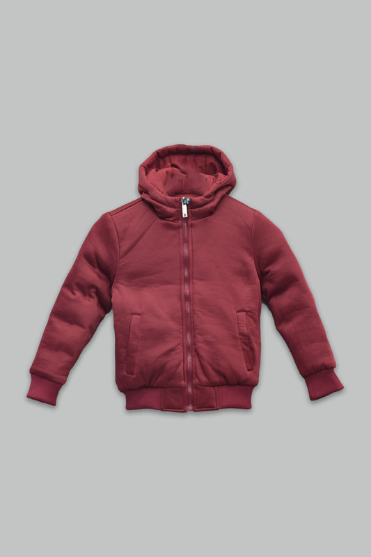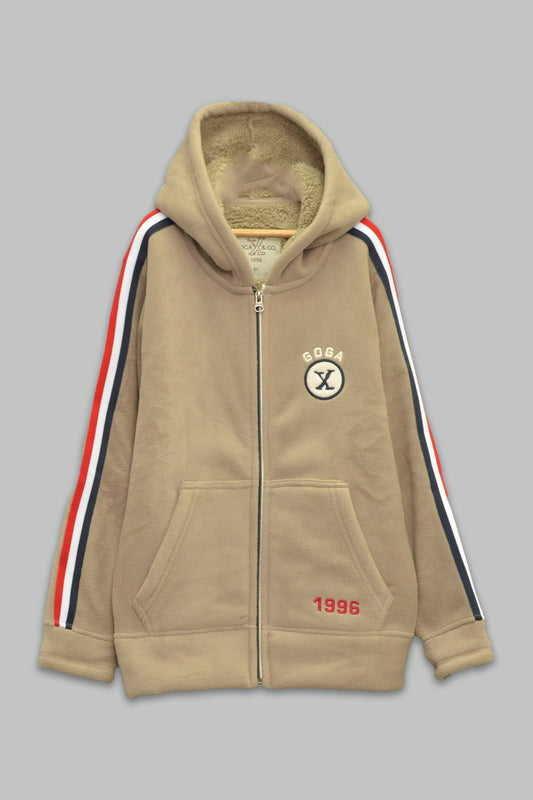 Sudadera sherpa niño bordada con manga larga, capucha ajustable, bolsas frontales y cierre.