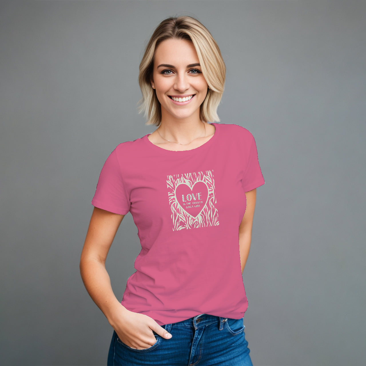 Playera para mujer con cuello redondo y manga corta, estampaciones gráficas combinadas a contraste al frente.