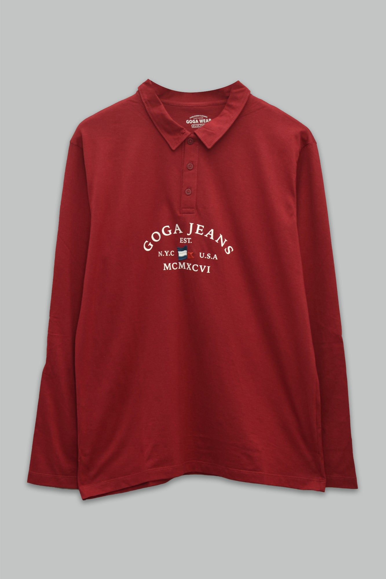 Playera para hombre con cuello tipo polo y manga larga, con estampados y bordados gráficos combinados a contraste al frente.